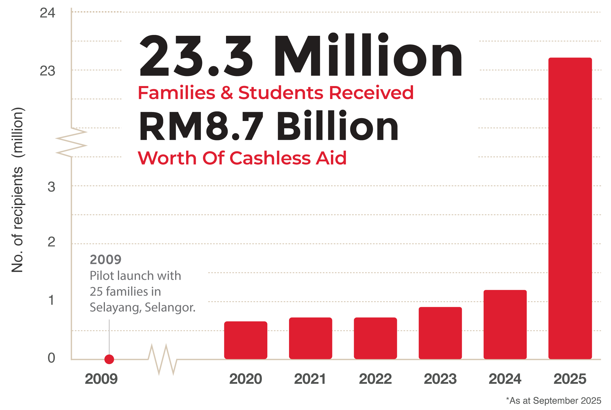 MyKasih started with a pilot MyKasih ‘Love My Neighbourhood’ food aid project involving 25 families back in 2009. To-date, we have channelled RM8.7 billion to more than 23.3 million families and students nationwide.